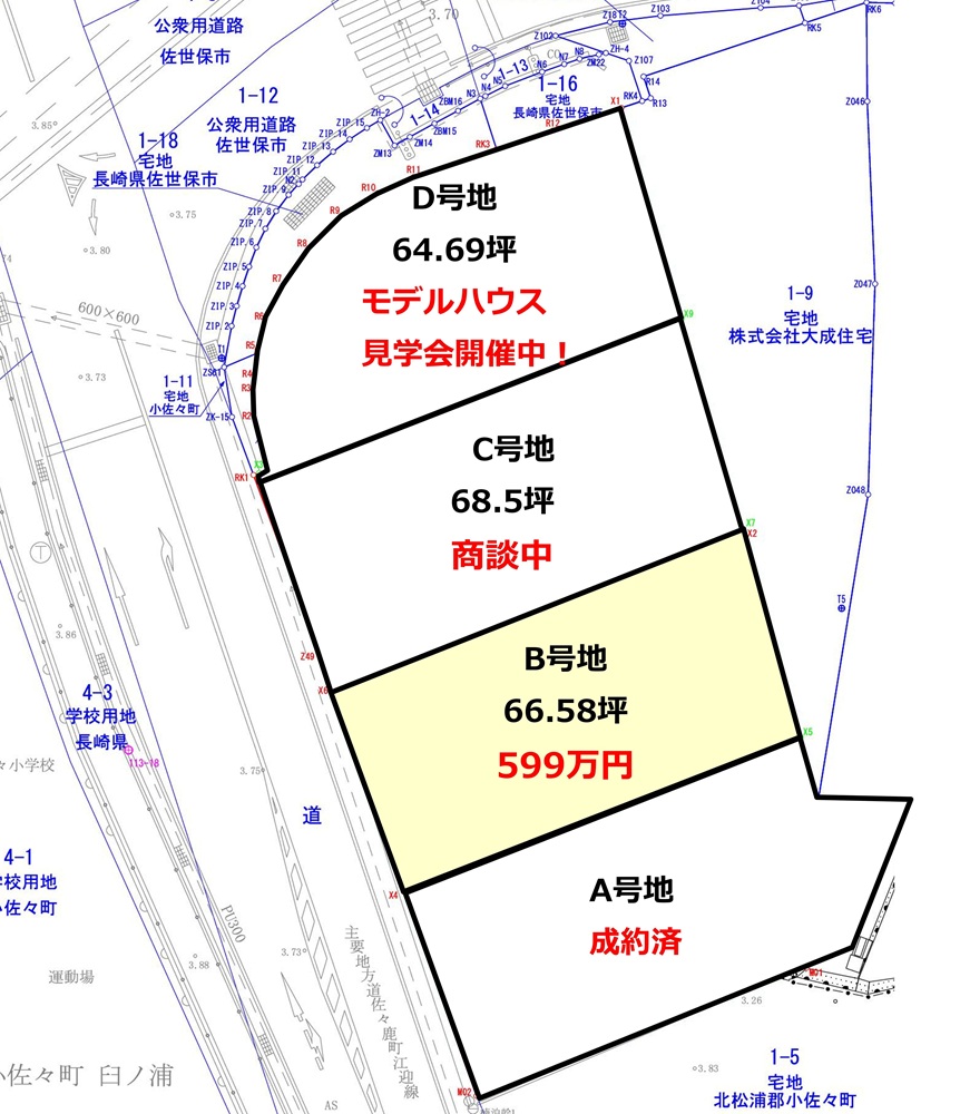 | 備考: | 4区画の価格は、次の通りです。 A号地 成約済 B号地 66.58坪(599万円) C号地 68.5坪(商談中) D号地 64.69坪(セルコホームモデルハウス 見学会開催中) |